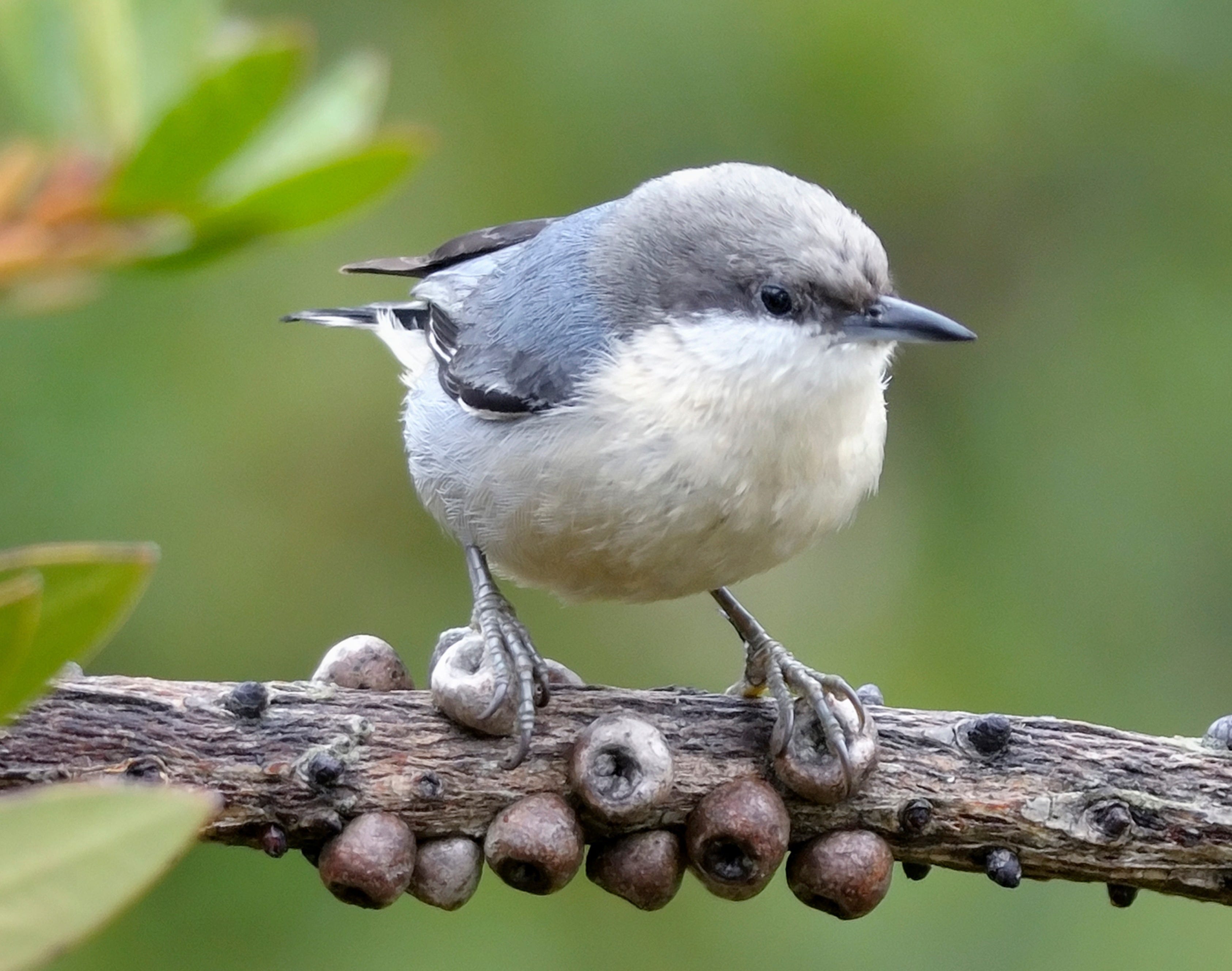 Look: Soft gray-blue above, off-white below, with a neat gray cap. True to name, the smallest nuthatch. (More photos here.)