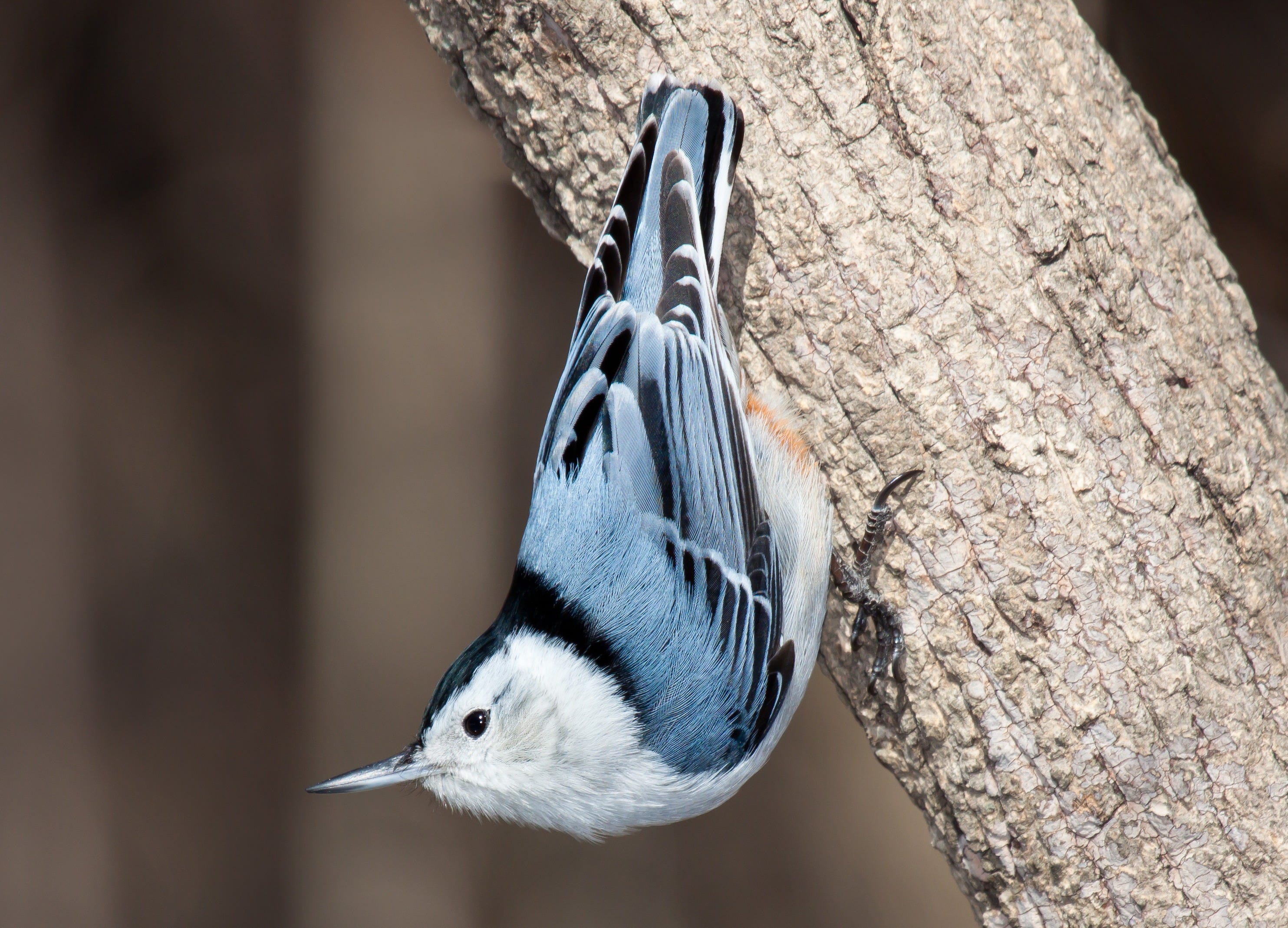Favorite allaboutbirds.org fact: “In winter, White-breasted Nuthatches join foraging flocks led by chickadees or titmice, perhaps partly because it makes food easier to find and partly because more birds can keep an eye out for predators. One study found that when titmice were removed from a flock, nuthatches were more wary and less willing to visit exposed bird feeders.”