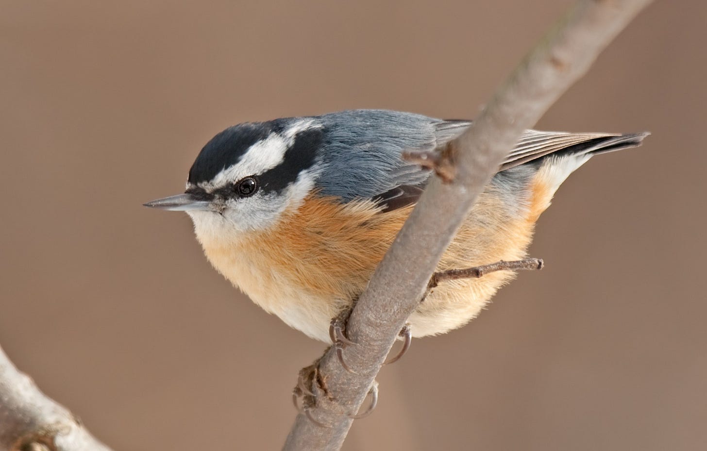 Look: Crisp black-and-white head stripes, blue-gray above, warm cinnamon below. The key to noticing a Red-breasted is that dramatic, isolated black eye-stripe—it’s giving Pris in Blade Runner. (More photos here.)